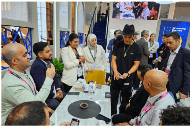 在阿联酋迪拜国际会展中心举行的中东美容展上,爱伯馨创造性地“Abracadabra”这一魔法咒语为主题,巧妙地将魔术与香气展示相融合,不仅为观众带来了视觉上的惊喜,更通过独特的展示方式,将香水的艺术性与魔术的奇妙性完美融合。