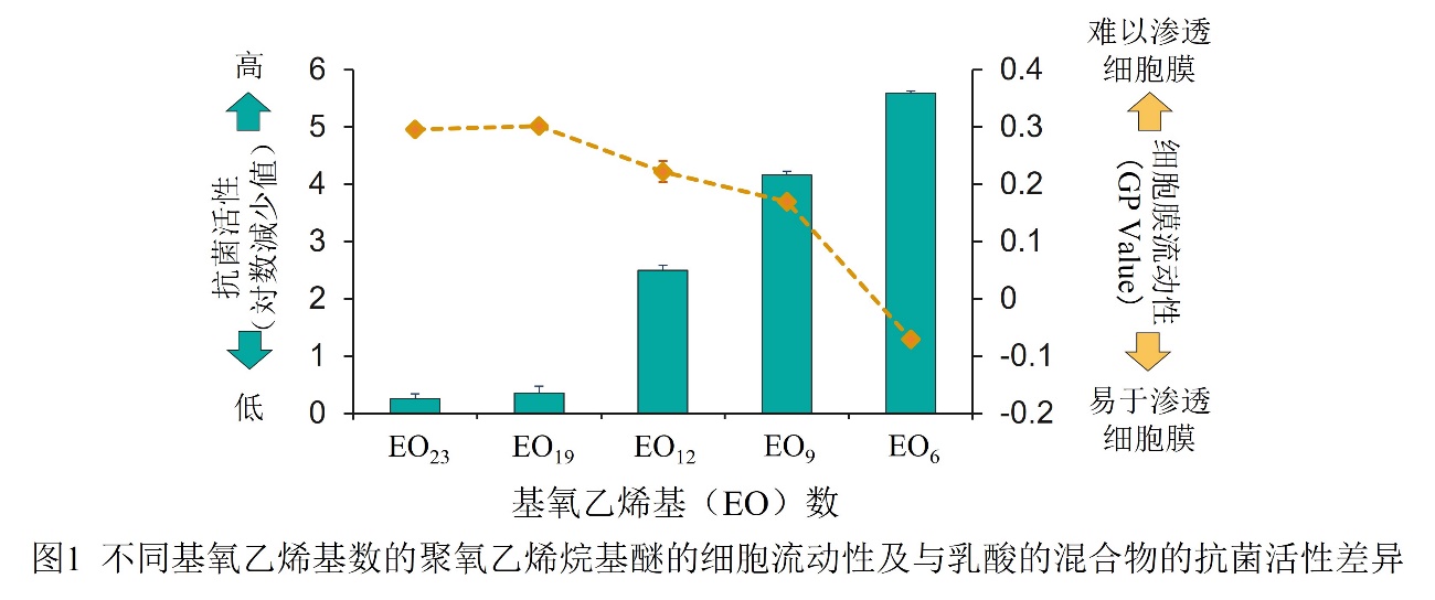 在长期积累的研究成果的基础上,花王尝试将能够提高人体皮肤表面天然的抗菌屏障功能的图层剂投入应用。该制剂为酸性(pH= 4.0)需涂布于皮肤表面,其中含有能作用于细菌和病毒的乳酸,以确保手部表面酸性环境。在选择作为基液的界面活性剂时,经过监测比对,选定了在酸性条件下较为稳定的聚氧乙烯烷基醚。为能同时满足使乳酸更易渗透入细菌的细胞膜这一条件而进行研究后发现,基氧乙烯基(EO)的数量越少,衡量细胞膜流动性的指标GP-Value*5就越低,乳酸也就越容易穿透细胞膜,并且,在使用含有乳酸的混合物时,对沙雷氏菌的抗菌活性*6也提高了(图1)。