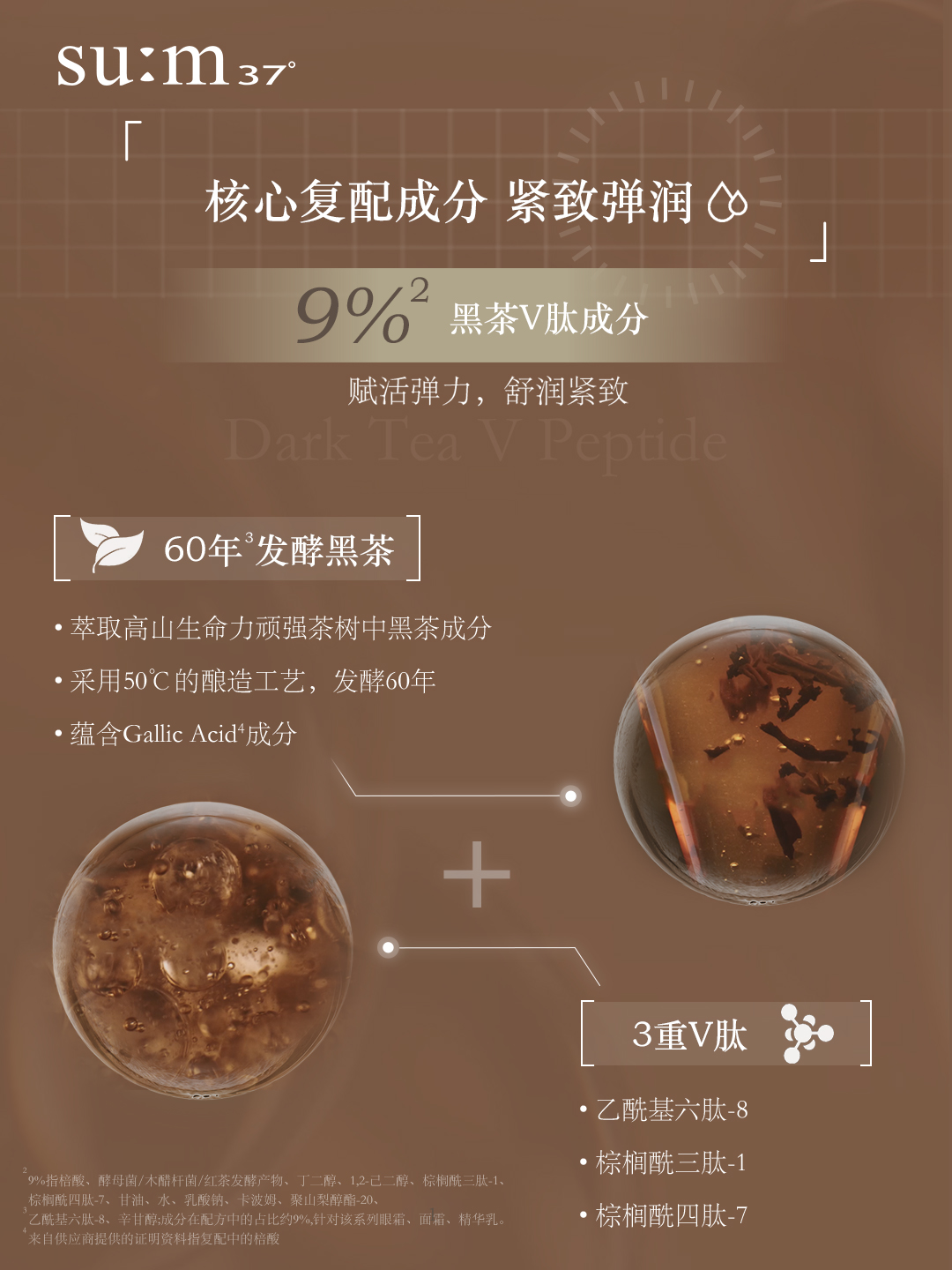 苏秘37°始终坚持以打造包含自然力量的肌肤为目标,不断于大自然中探索让肌肤持久美丽的奥秘。赋活悦升系列的核心成分黑茶V肽,其主要原料——黑茶,则选取自生于山林之中的高山茶树,虽常年历经风霜雨雪,却仍展现出独有的挺拔与韧性。品牌以高山茶树顽强的生命力为灵感,找到了让肌肤焕发弹力的纯净配方。将从高山茶树中提取出的茶成分采用50℃恒温酿造工艺,进行了长达60年的自然发酵,并把最终凝练成的60年黑茶酵萃与3重v肽(乙酰基六肽-8、棕榈酰三肽-1、棕榈酰四肽-7)复配为赋活悦升系列的核心成分——黑茶V肽。品牌在不断的钻研和探索中发现,加入了经过特殊发酵工艺复配得到的黑茶V肽成分,与以往的单一肽成分相比,更能有效改善肌肤松弛,提升弹力,同时该成分还兼具舒缓和保湿功效,成为了品牌解决敏感肌老化难题的一大步突破。
