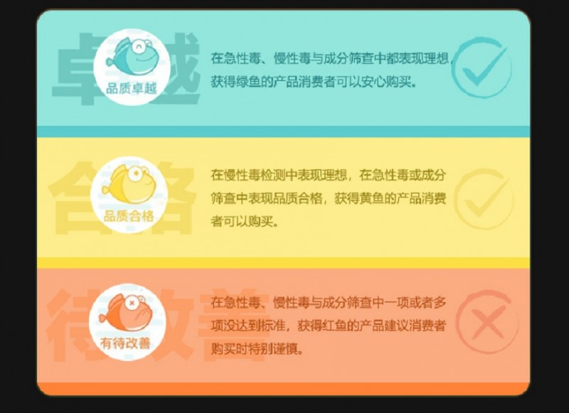 水中银小鱼亲测拥有20年的科研累积与应用诺贝尔奖技术,利用鱼胚胎生物检测技术,检测产品已知及未知安全性,最后将产品安全属性分为绿鱼、黄鱼、红鱼3个等级,便于消费者购买区分。